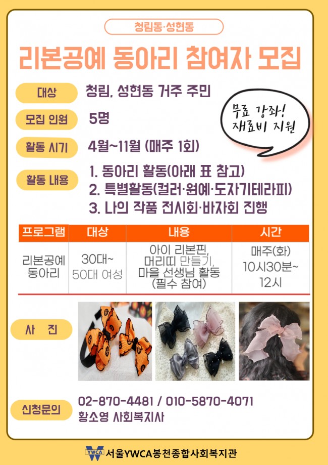리본공예동아리(모집마감) 페이지 정보 작성자 관리자 댓글 10건 조회 817회 작성일 22-04-04 13:51 본문 *선착순 모집 완료*많은 관심 감사드립니다. 목록 이전글이웃살피미 참여자 모집(마감) 22.04.11 다음글[추가 모집] 초등학생의 건강한 성장을 위한 ‘꿈자람 마을학교’ 21.12.28